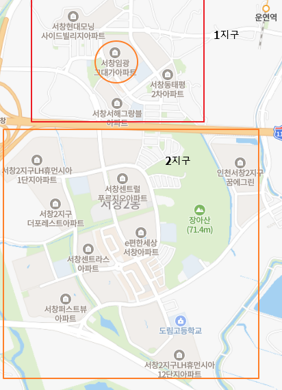 보시다시피 서창동은 1지구와 2지구로 나뉘어져 있습니다.