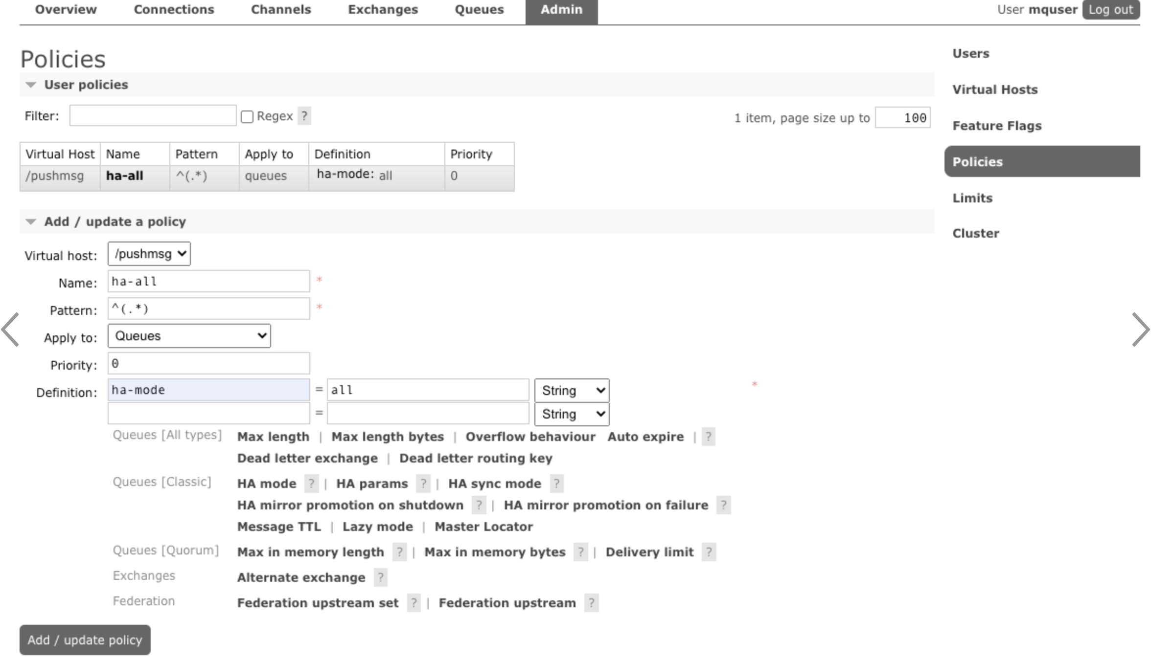 10. Queue HA 정책 설정
